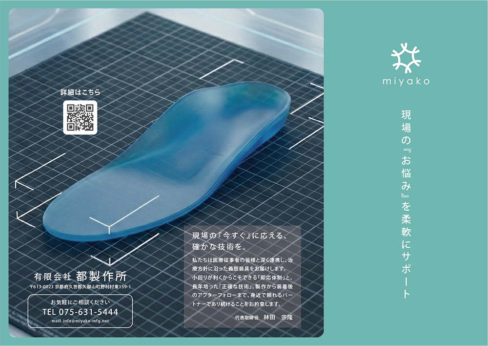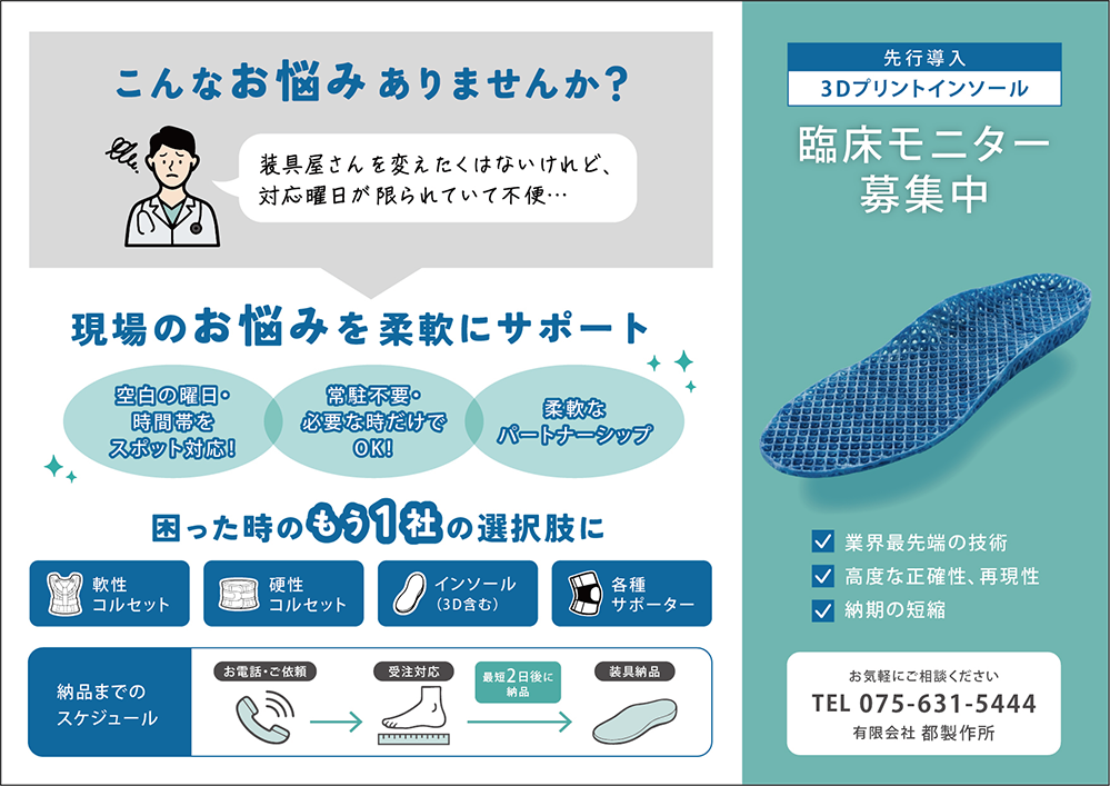 先にとロゴマークデザインや名刺デザインをさせていただきました、整形外科治療装具やコルセットを製作されている京都市の都製作所様より、会社案内となる3つ折りリーフレットの制作依頼をいただきました。